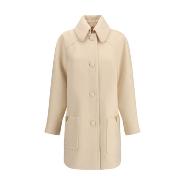 The Wool Drap Caban by Valentino is a refined outerwear piece with a classic collar and a relaxed fit. The design is enriched with the iconic V Gold detail on the pockets, a signature of the Maison. A front button closure and virgin wool construction with floral, striped, and VLogo lining complete the model’s elegance.